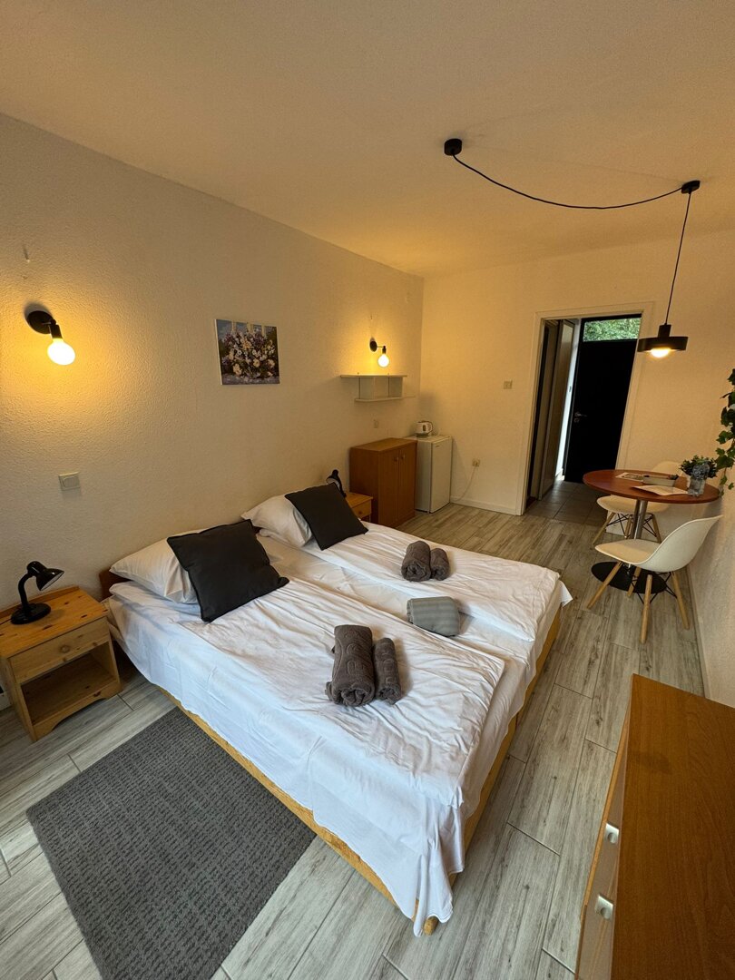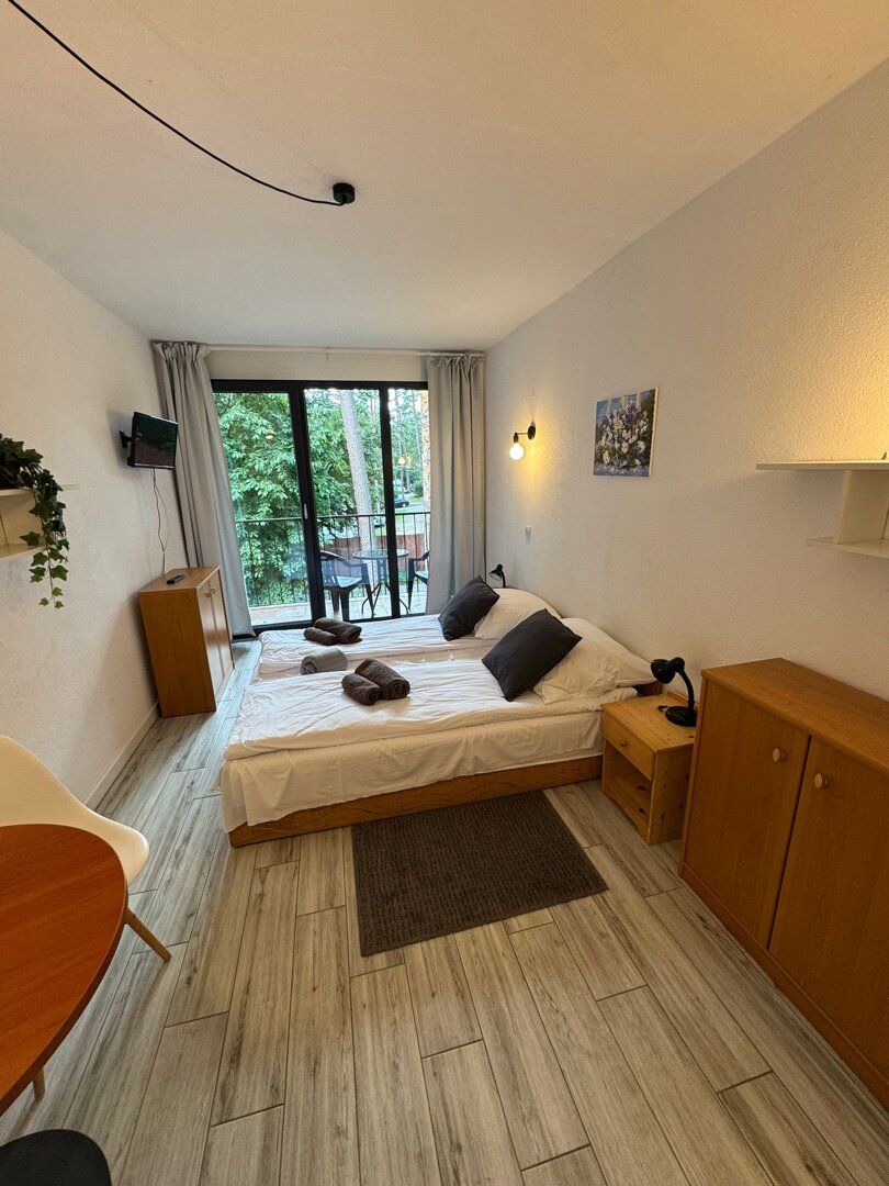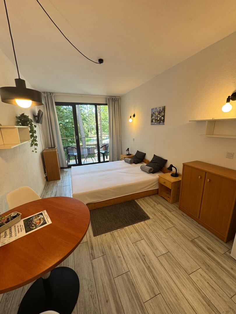 Apartament 35 to funkcjonalna przestrzeń dla dwóch osób z możliwością dostawki dla dziecka do 4 lat. Wnętrze obejmuje pokój dzienny z dwiema rozkładanymi kanapami, stołem z krzesłami, telewizorem oraz wyposażonym aneksem z lodówką, czajnikiem, naczyniami i sztućcami. Goście mogą korzystać także z prywatnego balkonu, który sprzyja relaksowi na świeżym powietrzu.