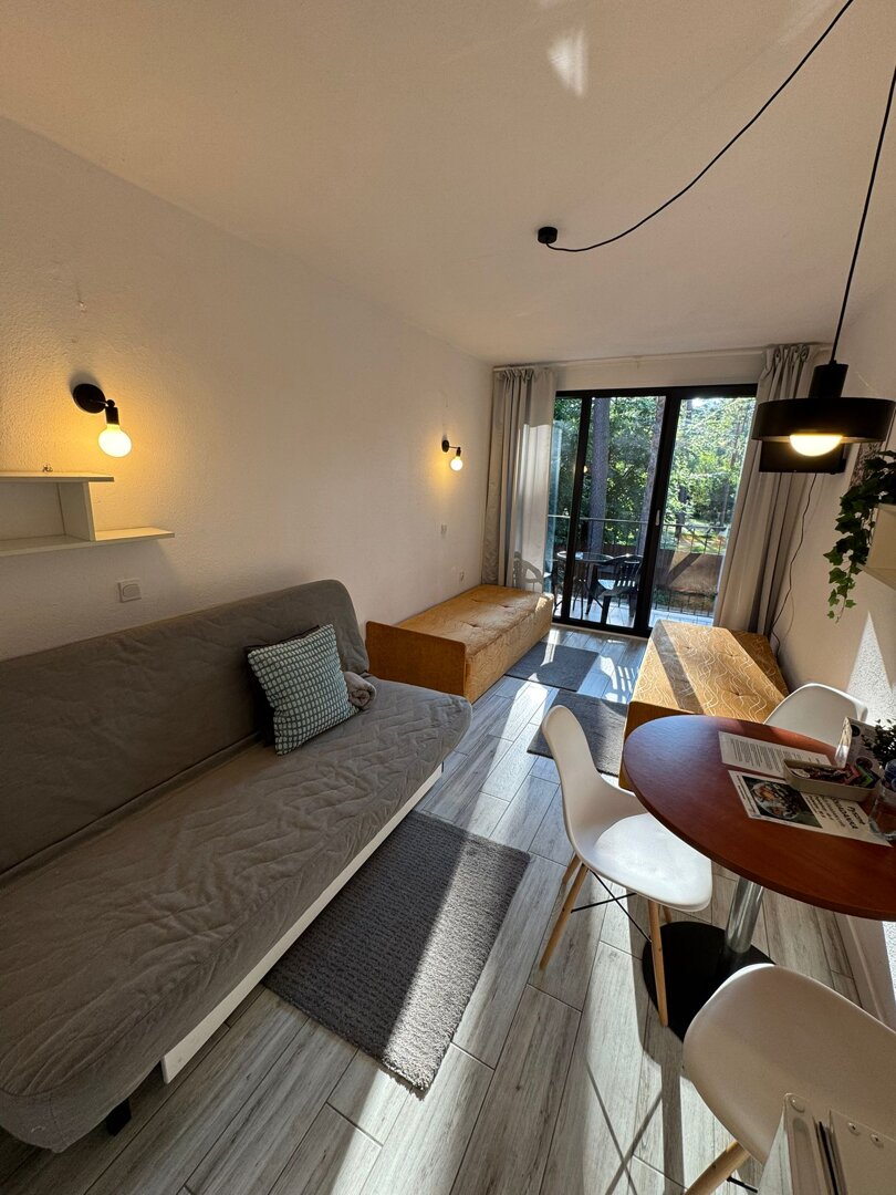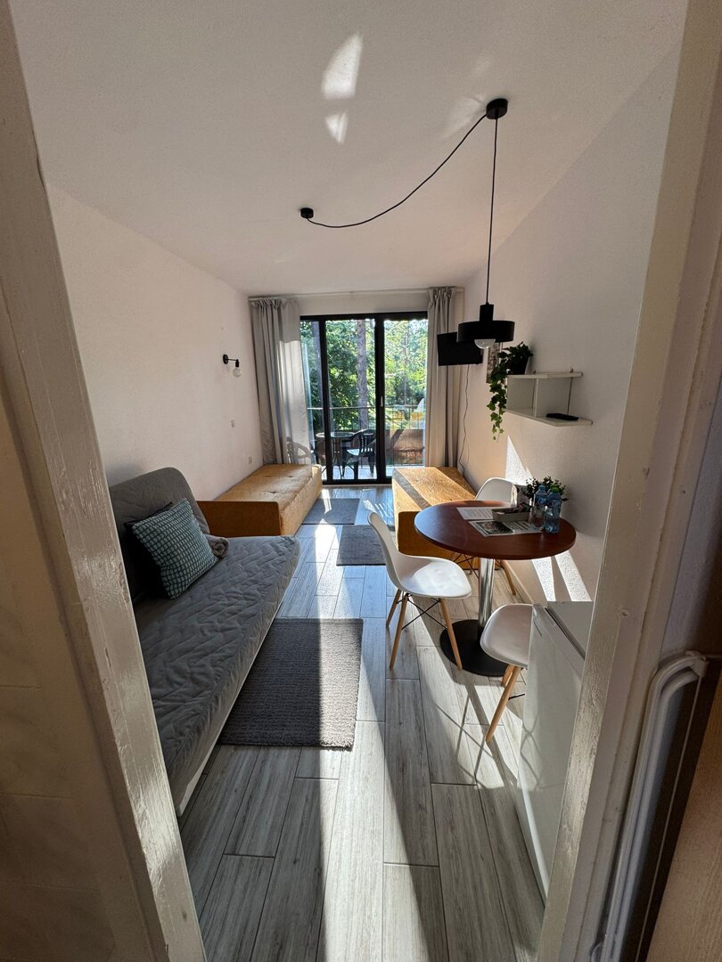 Apartament 36 oferuje wygodną przestrzeń dla dwóch osób z możliwością dostawki dla dziecka do 4 lat. W apartamencie znajdują się dwa tapczany, stół z krzesłami, telewizor oraz wyposażony aneks z lodówką, czajnikiem, naczyniami i sztućcami. Do dyspozycji gości jest również balkon – doskonałe miejsce na chwilę relaksu na świeżym powietrzu.