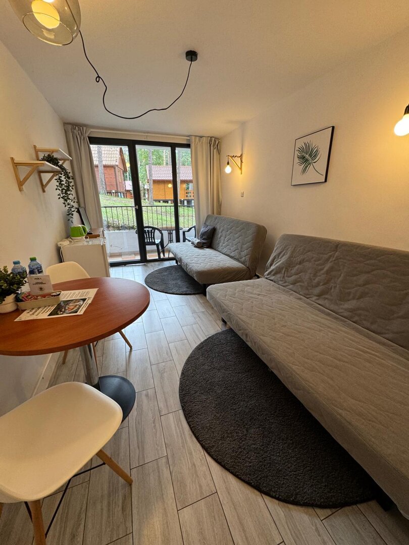 Apartament 6 to praktycznie urządzona przestrzeń dla maksymalnie 2 osób dorosłych oraz dziecka do 4 lat. Znajdują się tu dwie rozkładane kanapy, telewizor, lodówka, czajnik, podstawowe naczynia i sztućce, a także stół z trzema krzesłami. To wygodna opcja dla osób poszukujących prostego i komfortowego noclegu w Stegnie.