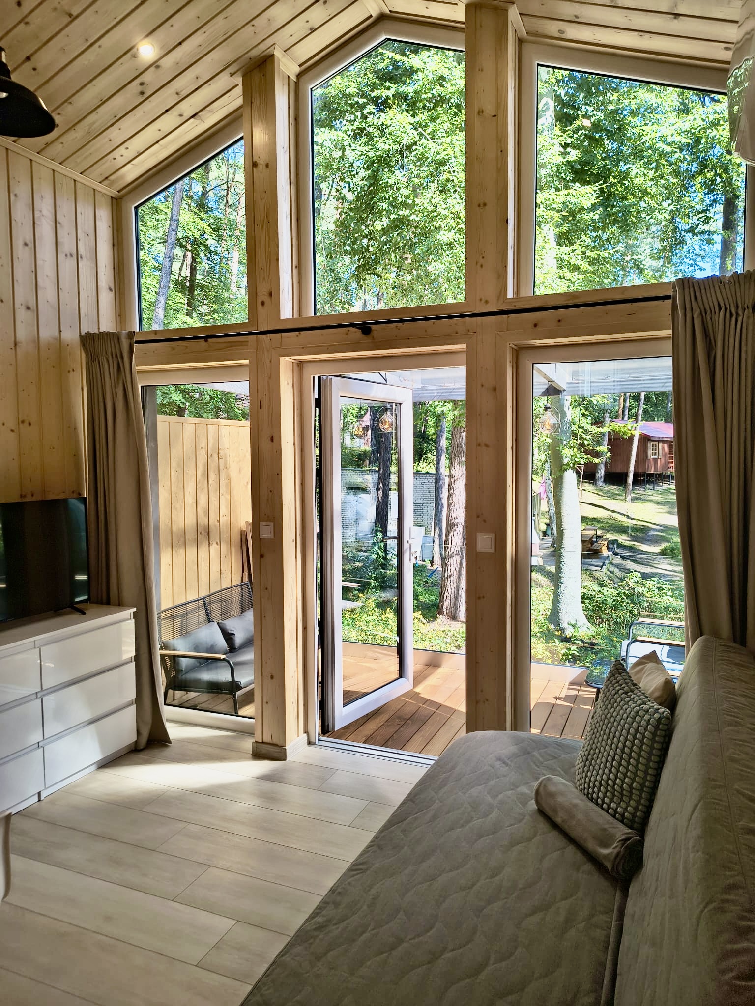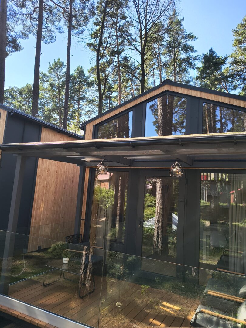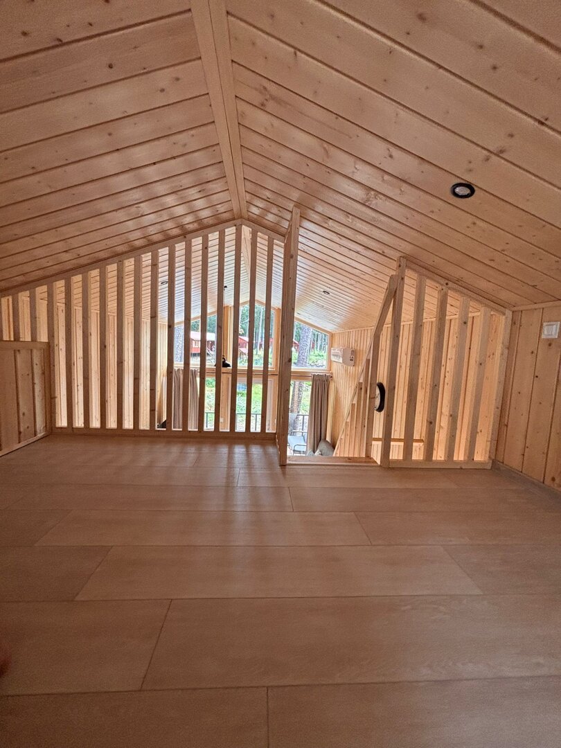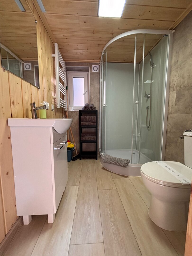 Domek 25 to w pełni wyposażony, komfortowy obiekt, przeznaczony dla 6 osób dorosłych i dziecka do 4 lat. Na parterze znajduje się sypialnia z łóżkiem 140×200 i szafą, przestronny salon z aneksem kuchennym, rozkładaną kanapą, stołem z pięcioma krzesłami, telewizorem, szafą i komodą. Aneks wyposażono w zmywarkę, płytę indukcyjną, lodówkę, czajnik oraz komplet naczyń i sztućców. Na antresoli znajduje się dodatkowe łóżko małżeńskie o wymiarach 160×200. Domek posiada również łazienkę z prysznicem oraz taras z zestawem wypoczynkowym i dwoma leżakami. Klimatyzacja zapewnia komfort niezależnie od pogody.