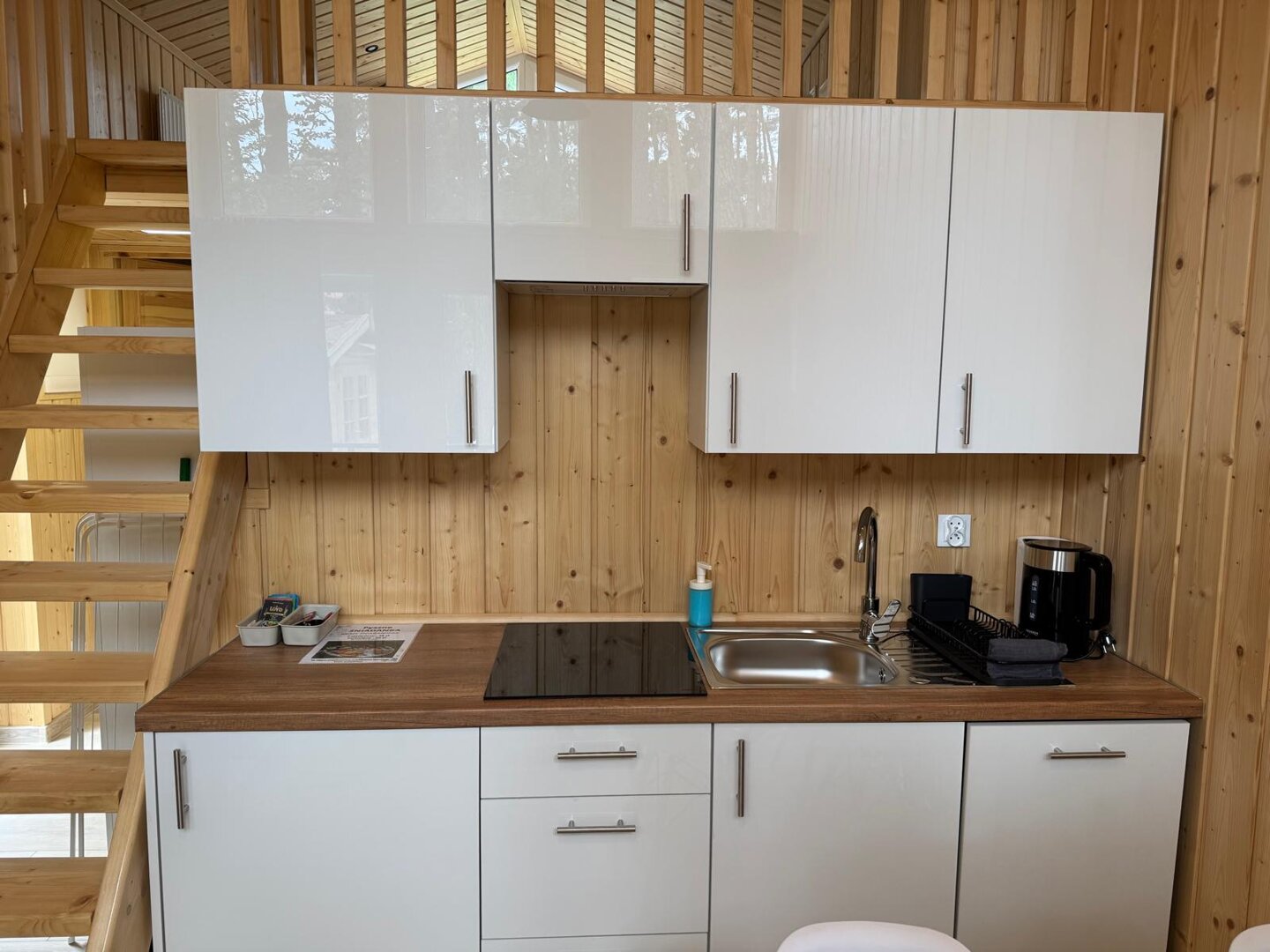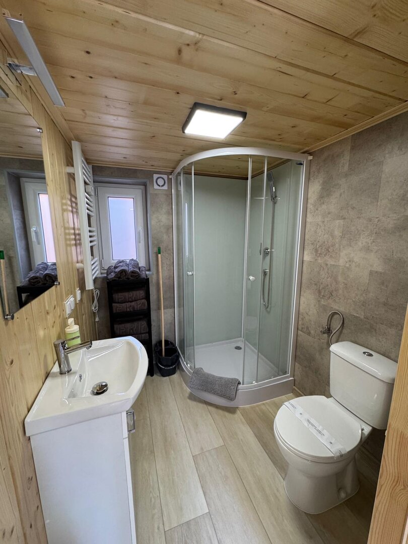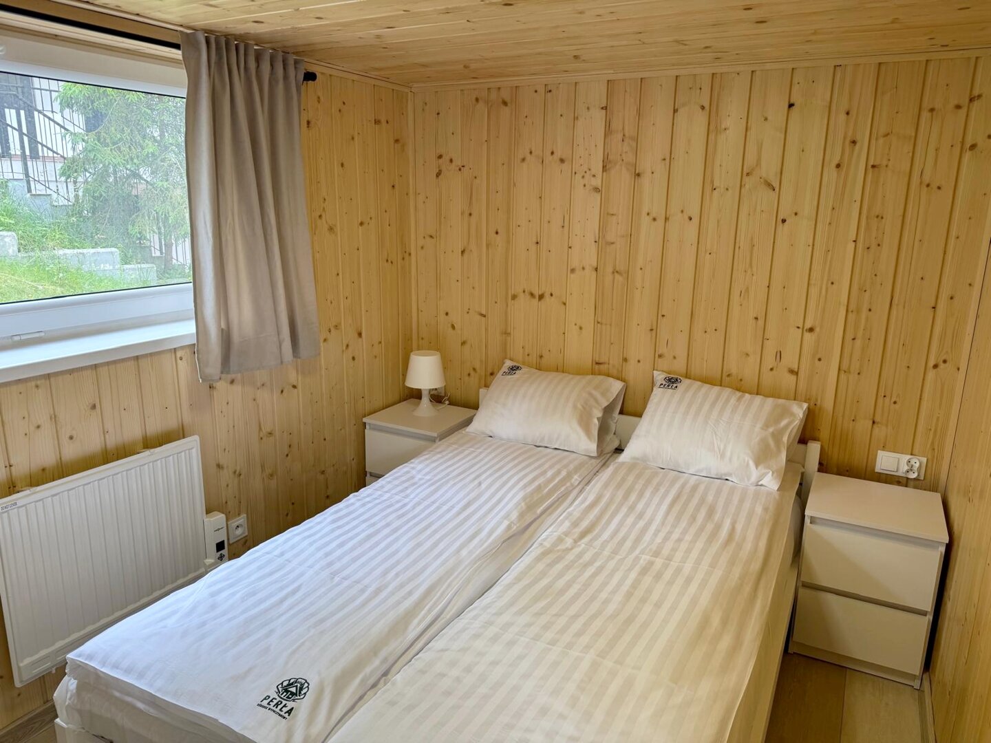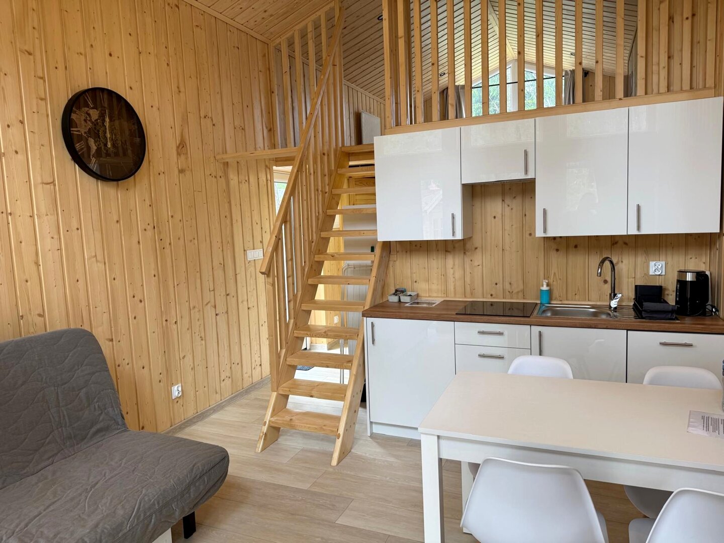 Domek 27 to komfortowe miejsce noclegowe zaprojektowane z myślą o rodzinach lub grupach znajomych. W sypialni znajduje się łóżko małżeńskie 140×200 i szafa. W salonie: rozkładana kanapa, stół z pięcioma krzesłami, telewizor, szafa i komoda. Aneks kuchenny wyposażono w zmywarkę, płytę indukcyjną, lodówkę, czajnik oraz komplet naczyń i sztućców. Na antresoli znajduje się drugie łóżko małżeńskie (160×200). Domek posiada łazienkę z prysznicem oraz przestronny taras z wygodnymi meblami wypoczynkowymi i leżakami. Klimatyzacja zapewnia komfortowy pobyt bez względu na pogodę.