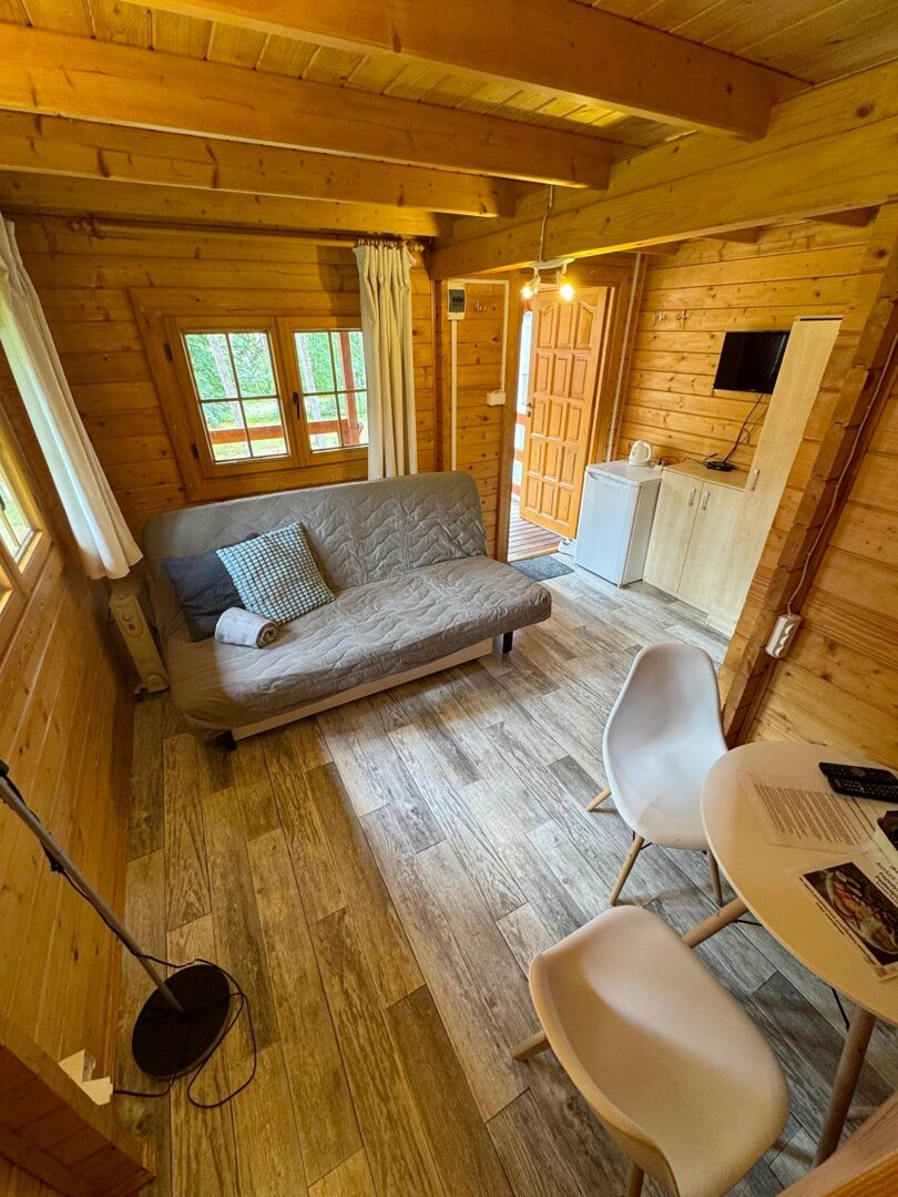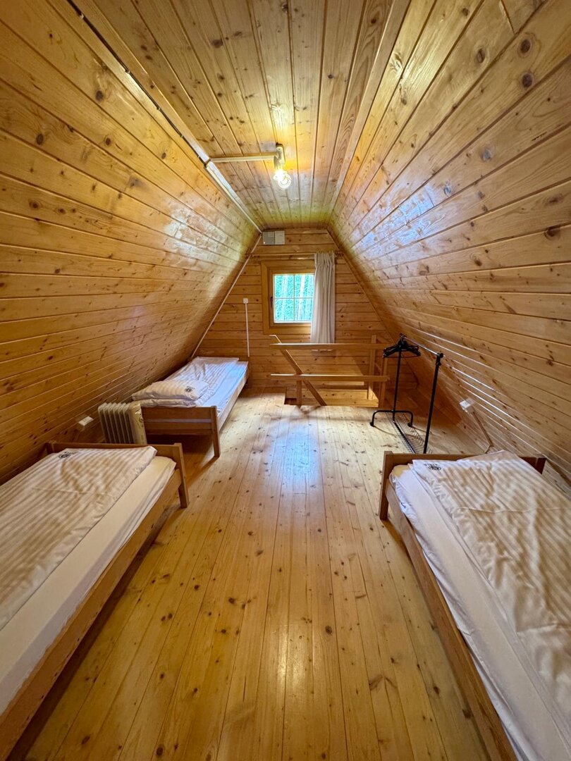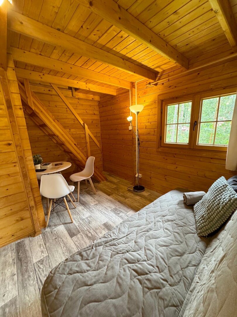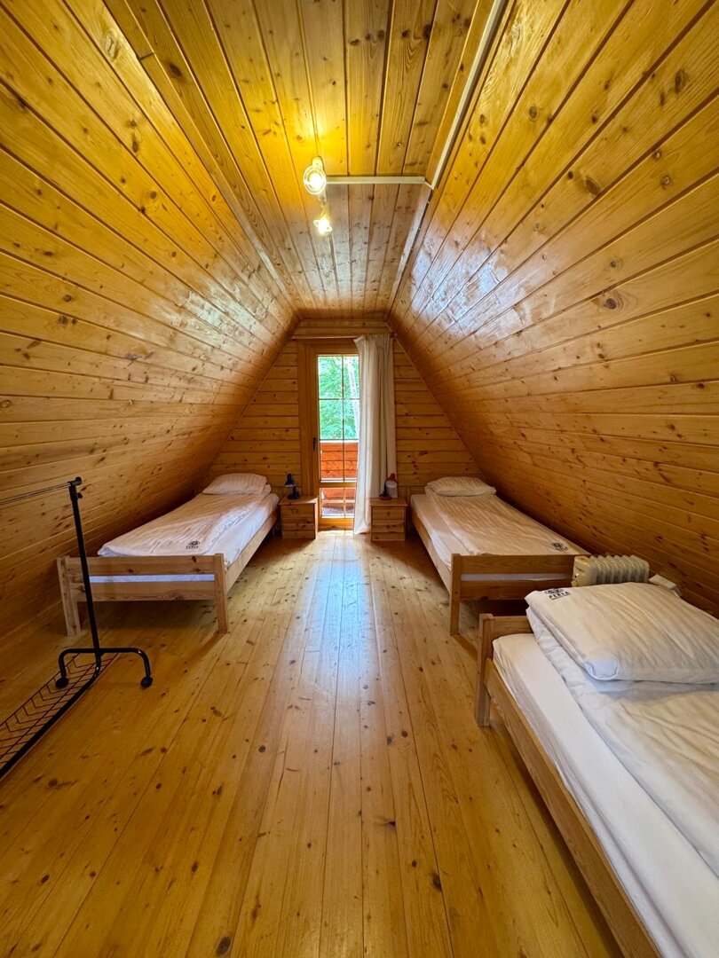 Irys 3 to przestronne miejsce noclegowe, które pomieści do 5 osób oraz dostawkę dla dziecka do 4 lat. Na piętrze znajdują się trzy pojedyncze łóżka, a na parterze rozkładana kanapa dwuosobowa, zapewniające wygodny sen dla całej rodziny lub grupy.
