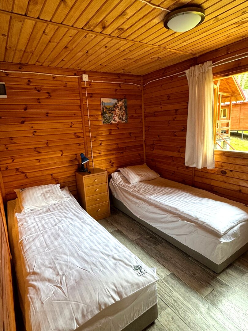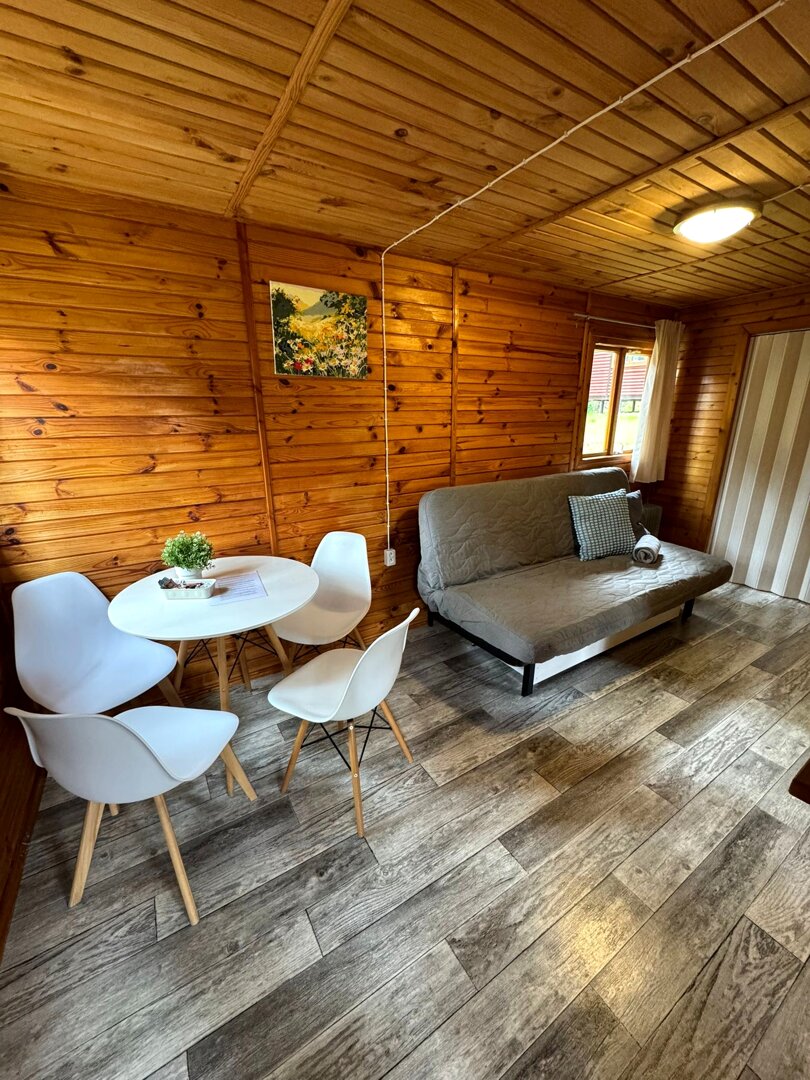 Krokus 2 to komfortowe domek z tarasem, który może pomieścić do 4 osób plus dostawkę dla dziecka do 4 lat. Do dyspozycji gości są dwa łóżka pojedyncze oraz rozkładana kanapa dwuosobowa. W domku znajduje się lodówka, czajnik, komplet naczyń, deska do krojenia, zestaw do parzenia kawy i herbaty, stół z czterema krzesłami oraz telewizor. Na wyposażeniu jest też pościel, ręczniki, mydło. To wygodne miejsce łączy funkcjonalność z przytulną atmosferą, idealne na relaksujący wypoczynek.