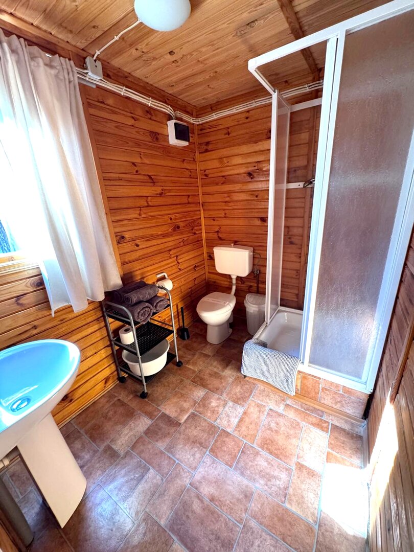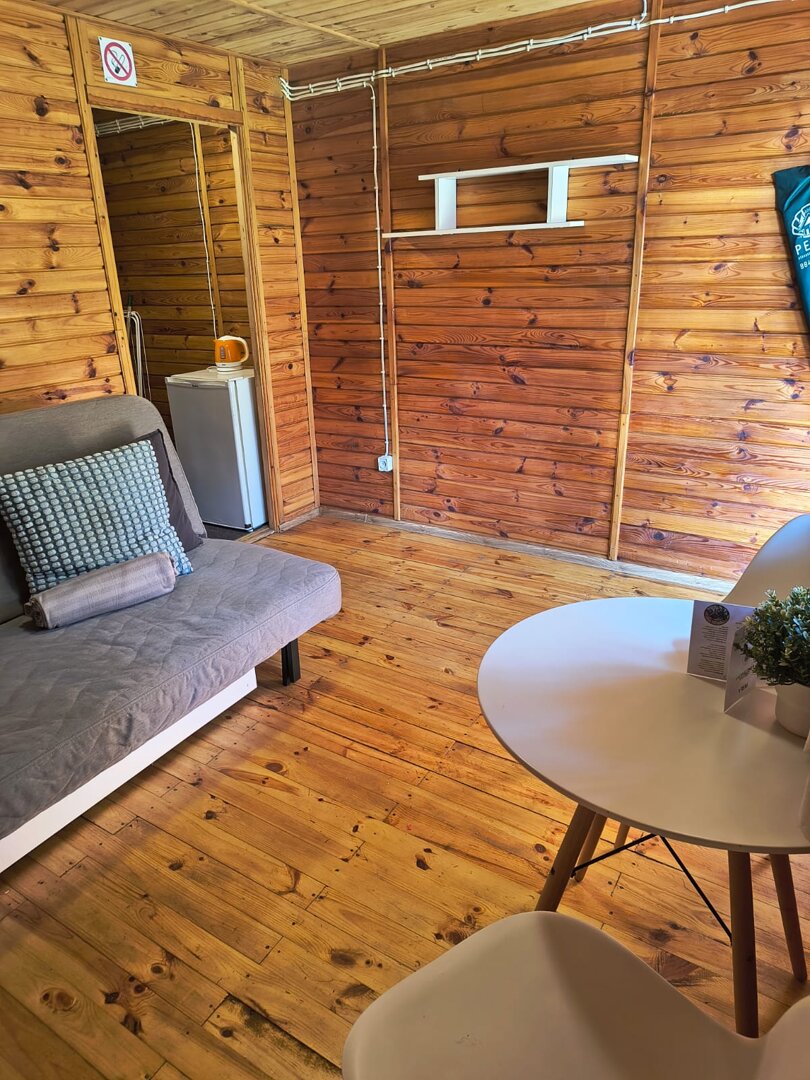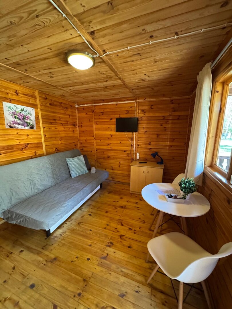 W domku znajduje się rozkładana kanapa dwuosobowa, stół z krzesłami oraz podstawowe wyposażenie kuchenne – sztućce, talerze, kubki, czajnik,lodowka i deska do krojenia. Goście mają również do dyspozycji telewizor.