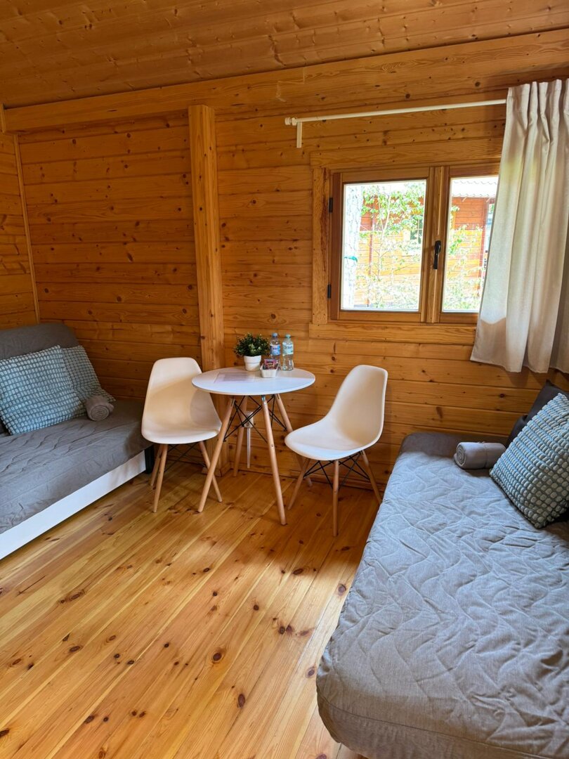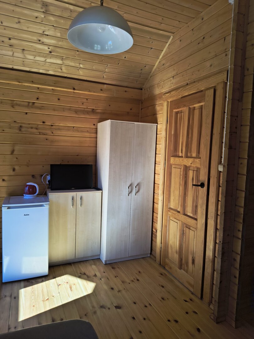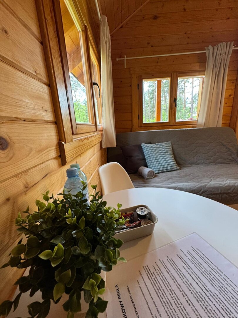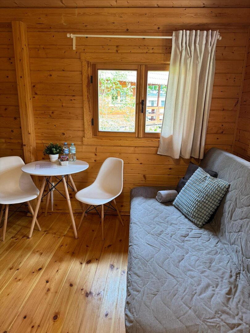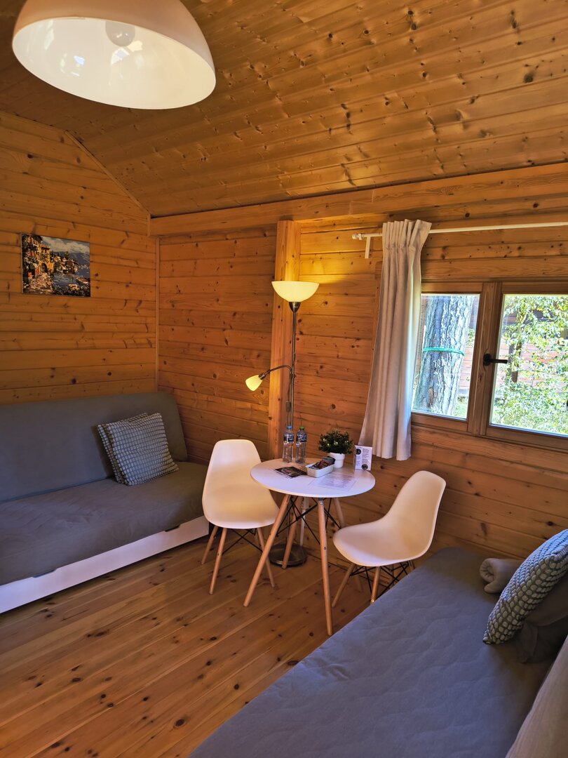 Domek wyposażony jest w dwie rozkładane kanapy dwuosobowe, stół jadalny z dwoma krzesłami oraz podstawowe udogodnienia:lodowka, czajnik, sztućce, kubki, talerze i deskę do krojenia. Goście mogą także korzystać z telewizora.